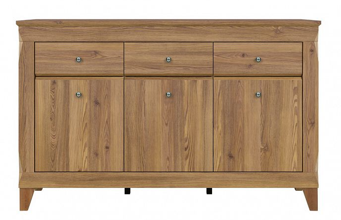 Zajímavá a moderní je komoda Bergen KOM3D3S v barevném provedení modřín sibiu zlatý. Obsahuje 3 šuplíky a pod nimi se nachází dvoudveřová skříňka s 2 policemi a jednodveřová skříňka s 1 policí.