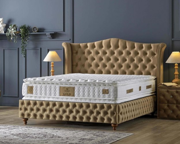 Čalouněná postel GOLD s oboustrannou matrací a úložným prostorem. Matrace je možné použít z obou stran, kdy obě strany mají stejnou tvrdost, tudíž při pravidelném otáčení můžete podpořit už tak dlouhou životnost této matrace a díky pěně z peří je i jednou z nejpohodlnějších matrací.