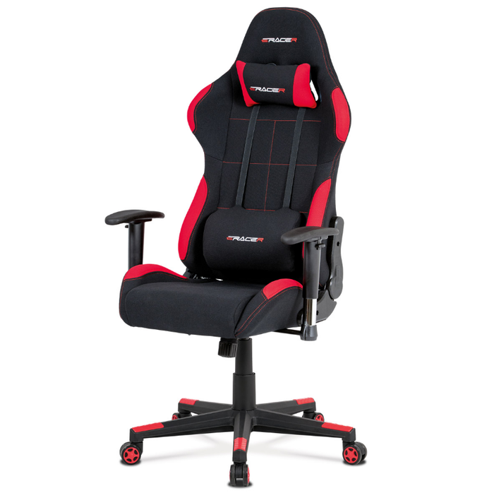 Moderní kancelářská židle ve sportovním designu v černé látce s červenými detaily se stane nezbytným doplňkem každého závodníka. Houpací mechanismus společně s opěrákem, který lze polohovat až do polohy 180°, zajistí dokonalý komfort. Univerzální (pogumovaná) kolečka, plastový kříž s protiskluzovými prvky, výškově nastavitelné područky. Součástí židle jsou 2 odnímatelné polštářky.
