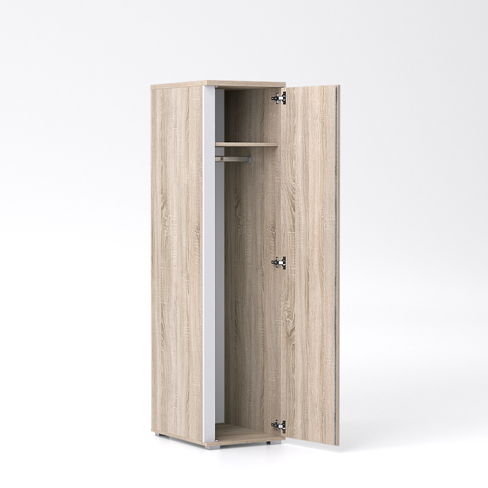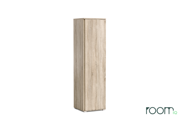 Vysoká úzká skříň s univerzálním osazením dveří, jednou policí a věšákovou tyčí. Police si můžete dokoupit a umístit dle vlastní potřeby.