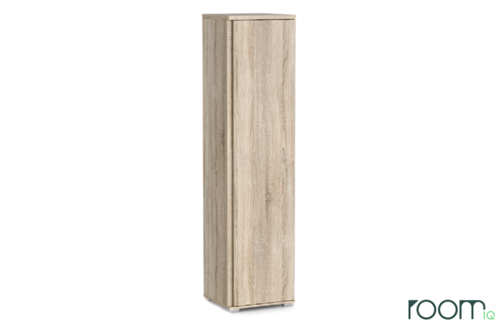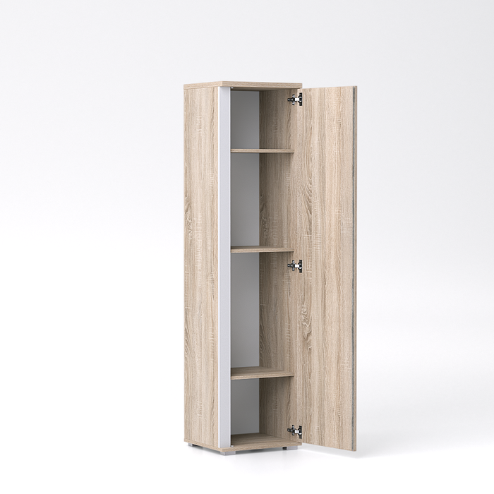 Vysoká úzká skříň s univerzálním osazením dveří. Police si můžete dokoupit a umístit dle vlastní potřeby.