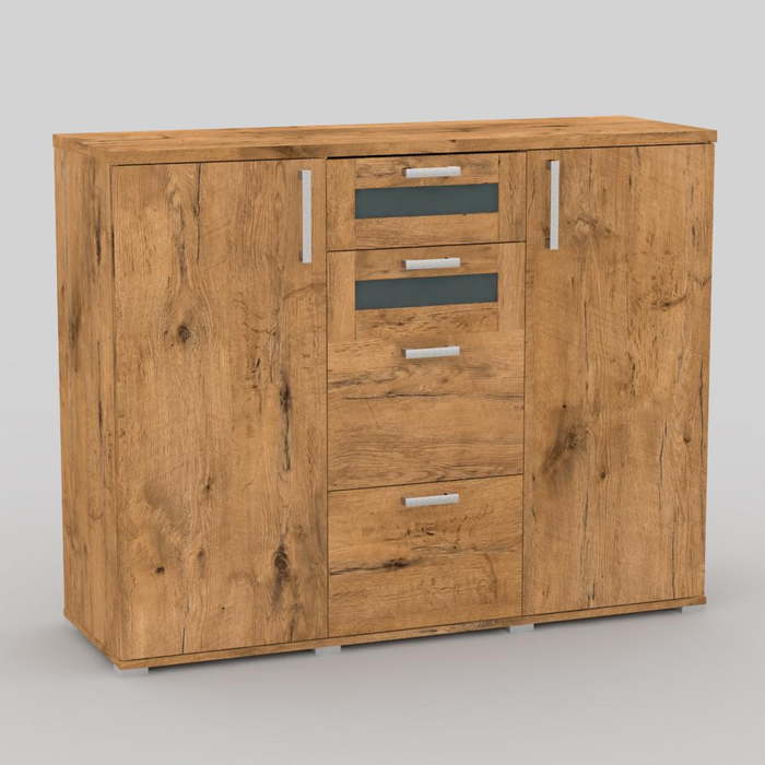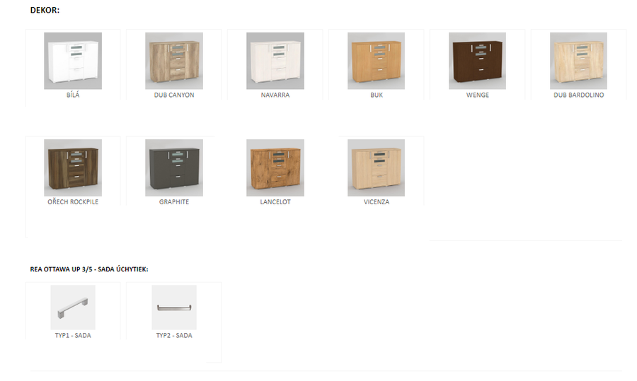 Na dvířka je použito kování s integrovaným tlumením. Komoda se dodává bez úchytek, úchytky je nutné objednat samostatně, možnost výběru TYP1, TYP2.