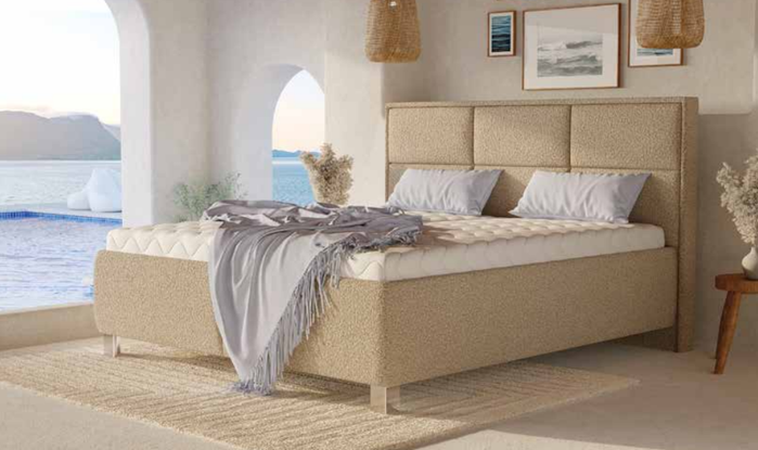 Luxusní manželská postel Vario Carmen s volně loženými matracemi, jejíž ručně čalouněné čelo vykládané šesti elegantními obdelníky bude dokonalým kusem nábytku do vaší ložnice.