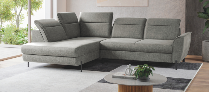 Sedací souprava VERSO UP-2F – rohová, rozkládací a s úložným prostorem. Regulovatelné opěrky hlavy – záhlavníky.