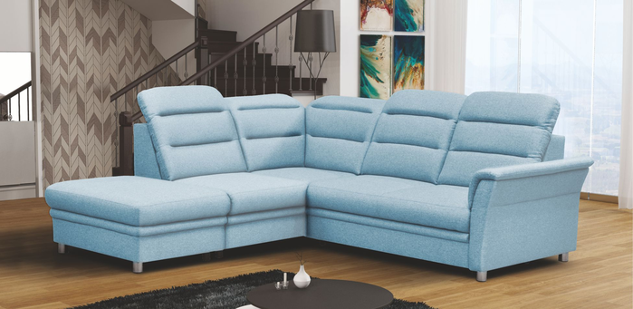Rohová sedací souprava XANTO má polohovatelné opěrky hlavy – záhlavníky, je rozkládací, s úložným prostorem. V sedáku je PUR pěna na vlnovci.